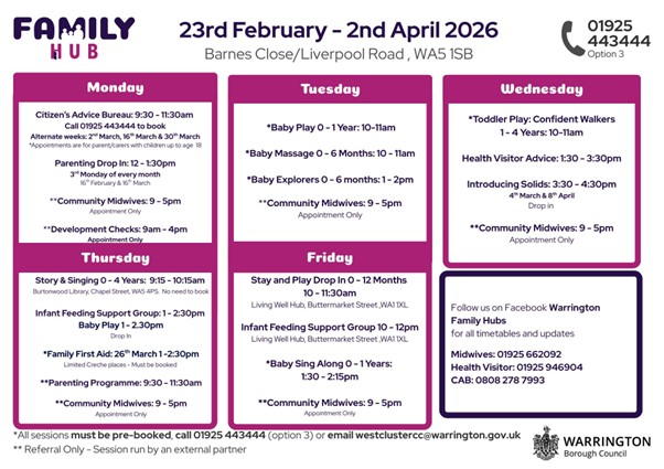 Barnes Close Family Hub is one of several Family Hubs across Warrington. Services vary slightly between hubs, and you can explore the timetables at all of them by visiting the main Family Hubs page.