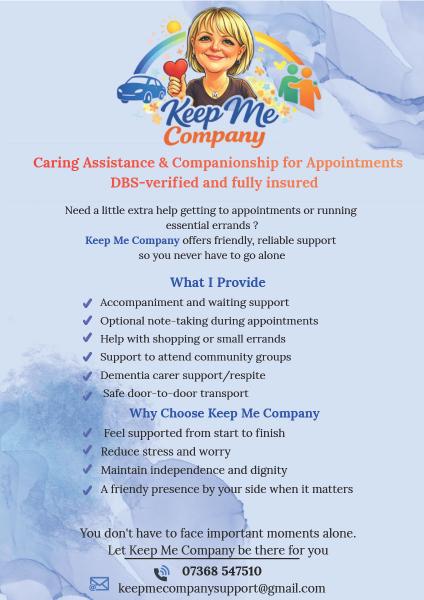 I provide friendly, reliable support for people who would benefit from a little extra help getting to and attending appointments, or simply having someone by their side. The aim is simple: to make things easier, less stressful, and ensure no one has to go alone. Here’s a quick overview of how I can help: