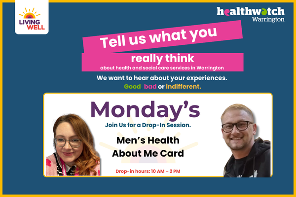 Join Crissi & Lee from Healthwatch Warrington Every Monday at the Living Well Hub, Horsemarket Street